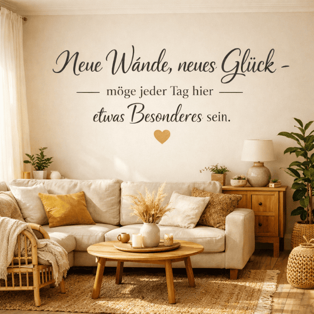 - Dekorative Gegenstände: Bedrucke Tassen, Kissen, Türschilder oder Fußmatten mit einem ausgewählten Spruch. Solche Alltagsgegenstände erinnern die Bewohner jeden Tag an deine guten Wünsche und bringen eine persönliche Note in das neue Heim.