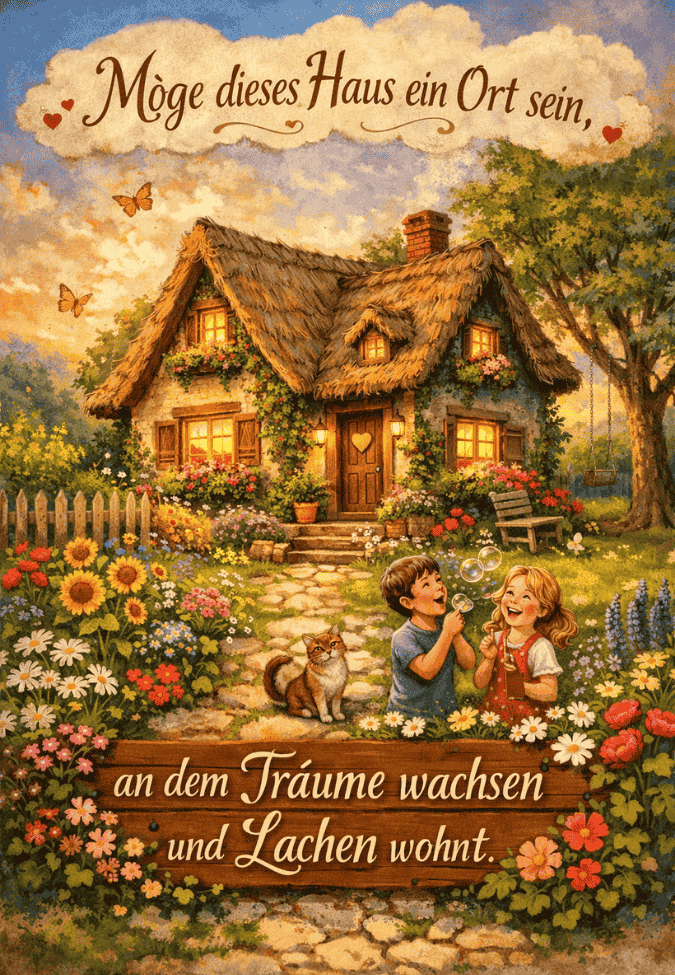 Solche tiefgründigen Worte passen gut zu einem kleinen Geschenk wie einer Kerze, einem symbolischen Schlüssel oder einem Fotoalbum. Sie erinnern daran, dass ein Zuhause mehr ist als seine Einrichtung – es ist eine Quelle von Erinnerungen und Gefühlen.